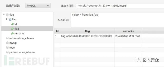 根据上一个flag的提示,去数据库里边看看,尝试一下mysql默认用户名密码root/root然后就连上了,首当其冲的就是flag数据库里边的flag表,直接读就完事了