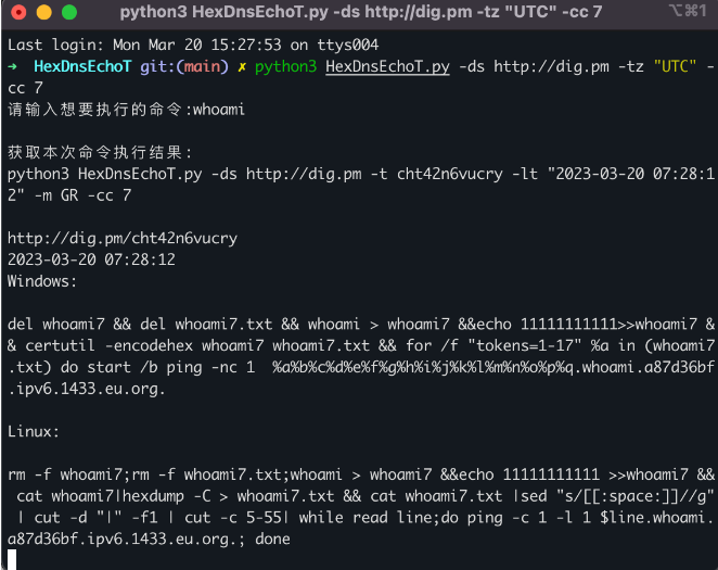 python3 HexDnsEchoT.py -ds http://dig.pm -tz "UTC" -cc 73、其中-cc 7为下图所示,dnsurl中5个点加2,为7
