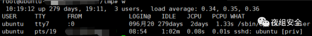 3、查看当前登录用户,看是否有攻击者与我们共同登录同一台主机,发现只有我自身ssh连接:
