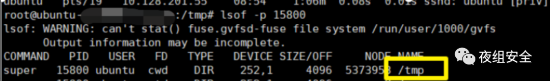 5、对相关进程使用 lsof -p命令进行查看,发现有个进程文件在tmp目录下,较为可疑: