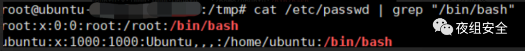 6、对主机可以登录的用户名进行检索,使用命令 cat /etc/passwd | grep "/bin/bash"发现仅有ubuntu、root账户可以登录: