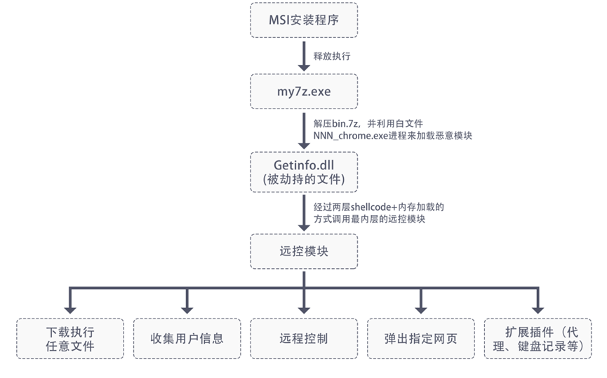 此外,“Xidu”病毒的大部分恶意功能以插件的形式进行下发,只内置较少的功能如:下载执行任意文件、弹出指定网页、收集计算机信息、远程控制等,其还可通过快捷方式将自身添加到注册表中实现持久化。同时,该病毒使用了多层“白加黑”技术(一种即利用可信程序加载恶意DLL的劫持技术)来躲避安全软件的查杀,隐蔽性很强。其中,“Xidu”病毒最早由MSI安装程序释放部分文件到用户主机中,主要用于执行my7z.exe和NNN_chrome.exe程序。my7z.exe首先负责解压bin.7z中的文件并释放出黑白文件以及shellcode。bin.7z解压后,将通过多层白文件来绕过杀毒软件的查杀,MSI安装程序则会继续执行白文件NNN_chrome.exe,该程序后续会导入另一个白文件Sysinv.dll,而Sysinv.dll最终将导入并执行被劫持的Getinfo.dll。