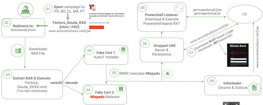 研究人员确定了 20 个针对智利、墨西哥、秘鲁和葡萄牙的不同垃圾邮件活动。攻击者试图在访问网上银行、学校、政府服务、社交媒体、游戏、电子商务时窃取用户的凭据,公共存储库等,还针对 Outlook 电子邮件凭据。即使在某些情况下,攻击者也可以向受害者展示,必要时伪造网上银行窗口。对于最初的感染,攻击者试图引诱受害者打开不同类型的假账单来支付,以 HTML 页面或受密码保护的 PDF 文件形式出现。