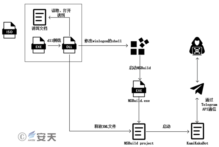 本次攻击活动的初始样本均为打包的ISO文件,按照攻击流程可分为两类:一类是采用DLL侧加载的方式,释放包含恶意XML文件载荷并通过修改注册表实现持久化。恶意 DLL 还会创建计划任务定时注销登录用户,在登录Windows用户时,通过调用MSBuild.exe(Microsoft 生成引擎)启动恶意载荷KamiKakaBot,实现远程控制功能;另一类采用DLL侧加载攻击的方式进行初始攻击,恶意DLL解密出PE文件并在内存中加载执行,内存中的PE文件会将启动代码添加至注册表中实现持久化,启动代码用于解密并启动恶意载荷TelePowerBot,实现远程控制功能。