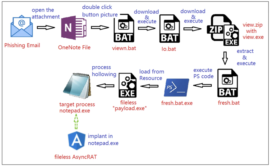 最近引起研究人员注意的几个网络钓鱼活动被发现利用带有恶意 Microsoft OneNote 文件的网络钓鱼电子邮件来传播 AsyncRAT 恶意软件。在本次分析中,可了解此次攻击的内容,例如发起活动的钓鱼邮件类型、恶意 Microsoft OneNote 文件如何参与活动、如何利用它在受害者的计算机上下载并执行恶意文件、相关设备使其能够逃避检测和分析的技术种类以及恶意软件 AsyncRAT 如何与其 C2 服务器通信,包括它支持哪些控制命令以完全控制受害者的设备。