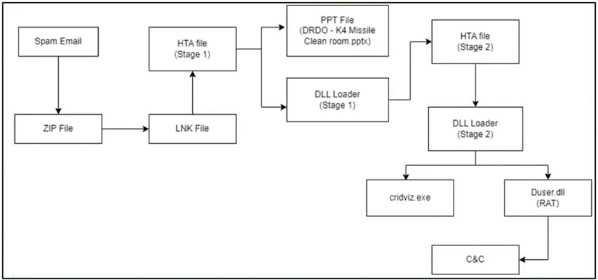 最近,研究人员发现了一条Twitter帖子,内容是 SideCopy APT 正在进行的针对印度政府“国防研究与发展组织”的活动。DRDO 是一个政府机构,负责研究和开发供印度武装部队使用的先进技术。最初的感染始于一封垃圾邮件,其中包含指向受感染网站上托管的恶意文件的链接。该链接允许用户从以下 URL 下载包含名为“DRDO – K4 Missile Clean room.pptx.lnk”的 LNK 文件的 ZIP 文件。