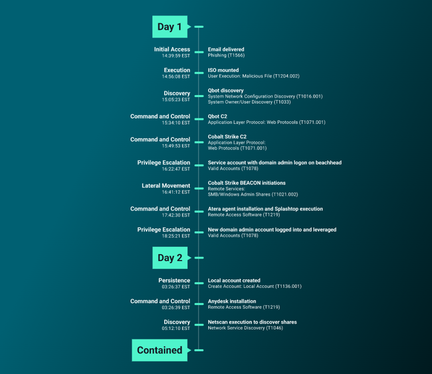 攻击者通过发送到最终用户收件箱的网络钓鱼电子邮件实现了初始访问——已经绕过了过于宽松的安全解决方案。这封网络钓鱼电子邮件导致了 QBot 恶意软件的部署,并为攻击者提供了在环境中的初步立足点。他们获得了属于域管理员组的有效服务帐户凭据,为横向移动和部署其他 Cobalt Strike 信标铺平了道路。从初始 QBot 执行到横向移动的时间线为 77 分钟。这比大多数此类案例要快得多,后者的爆发时间通常约为2 小时。