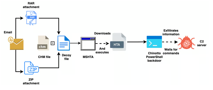 2022 年 10 月,研究人员确定了位于顿涅茨克、卢甘斯克和克里米亚地区的政府、农业和运输组织的活跃感染。尽管最初的攻击途径尚不清楚,但下一阶段的细节暗示会使用鱼叉式网络钓鱼或类似方法。受害者导航到指向托管在恶意 Web 服务器上的 ZIP 存档的 URL。存档又包含两个文件: