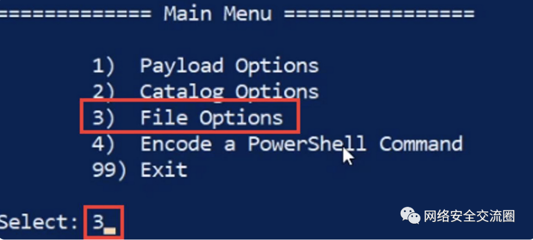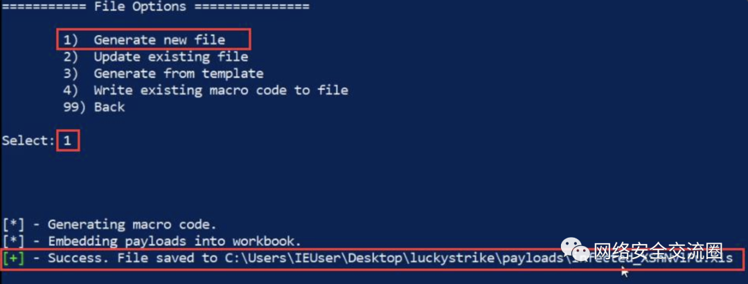 10、我们现在可以通过导航回到Luckystrike主菜单并选择“文件选项”菜单选项来生成恶意文档,如下面的屏幕截图所示。