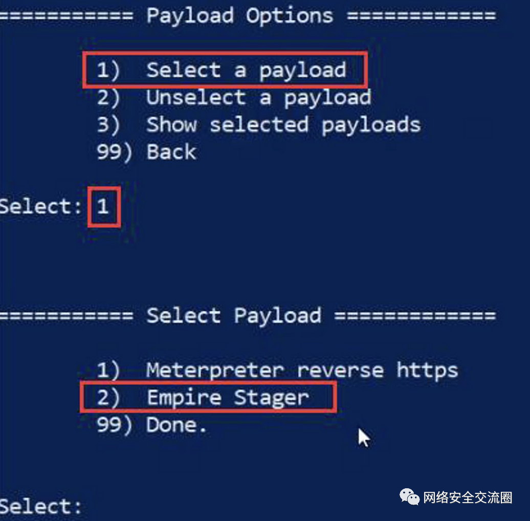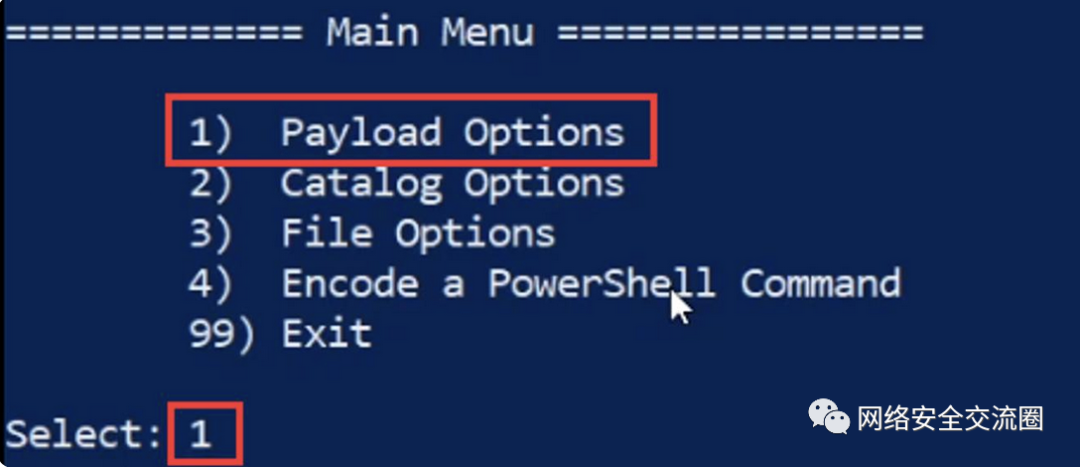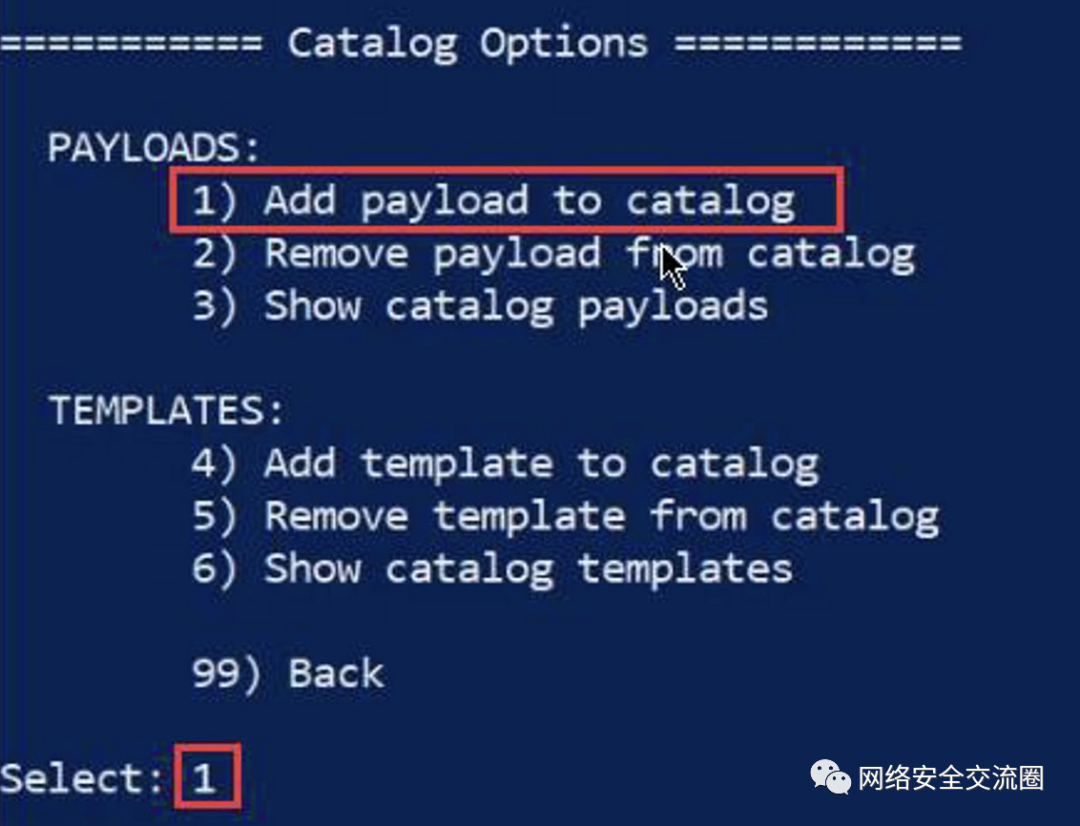 3、我们现在需要向目录中添加一个有效负载,这可以通过选择选项1来完成,如下面的屏幕截图所示。