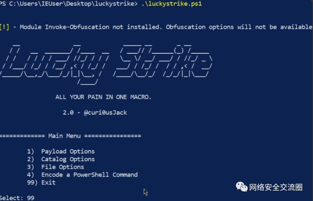 在将stager从Kali VM转移到Windows VM之后,我们可以开始使用Luckystrike生成恶意宏文档的过程。cd .\ luckystrike.\ luckystrike.ps1