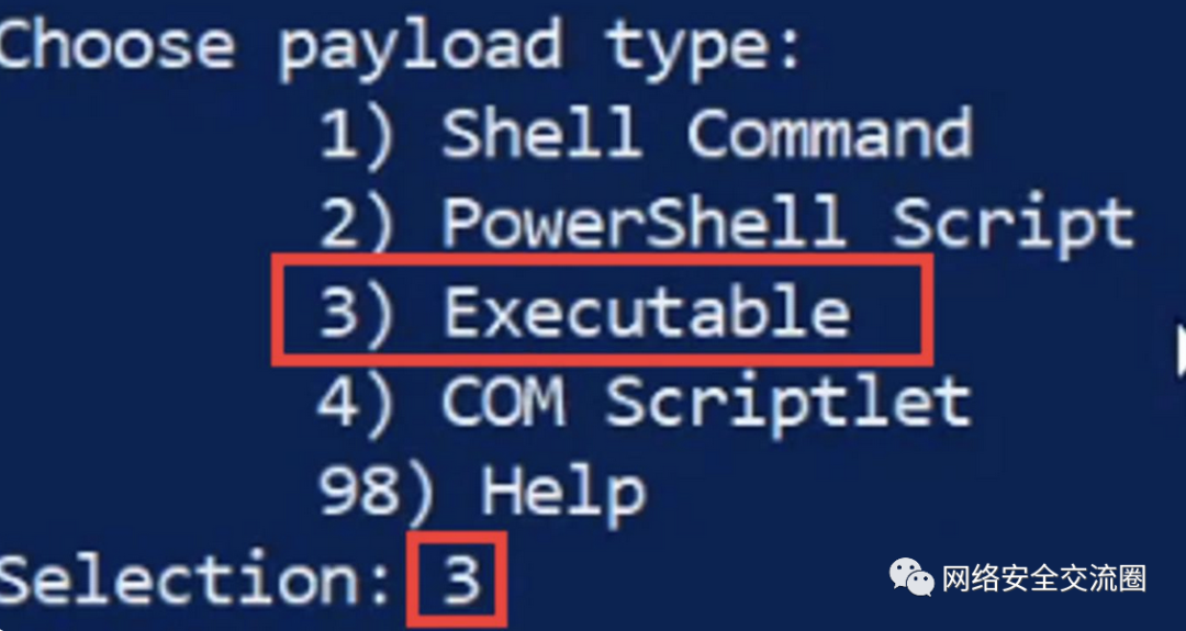 5、下一步是选择一个有效负载类型,在我们的例子中,我们的stager是一个可执行文件,所以我们将选择选项3,如下面的屏幕截图所示。
