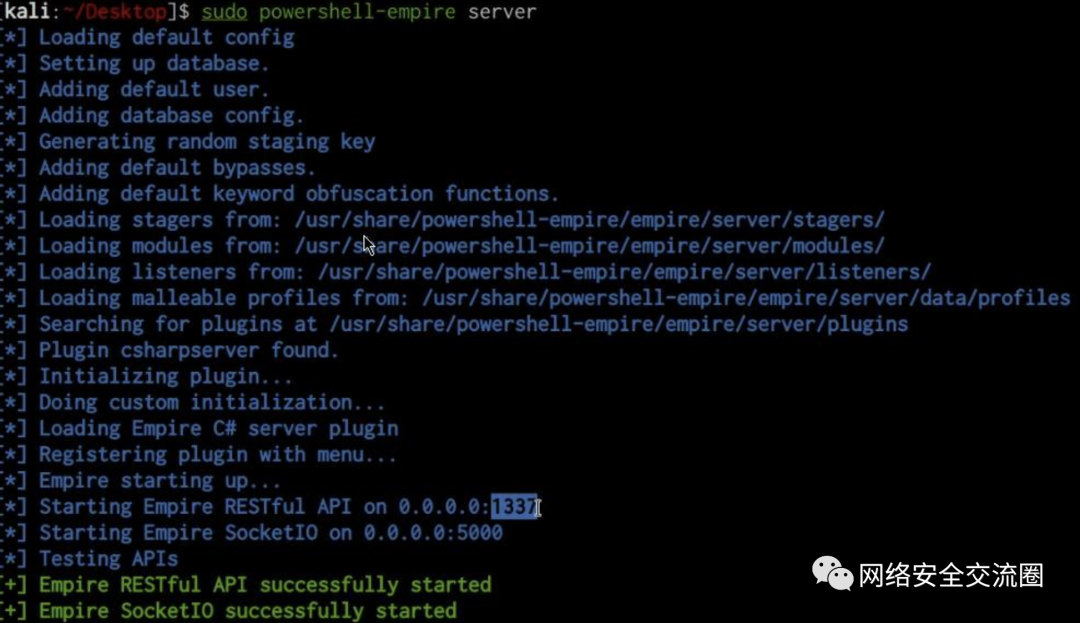 sudo powershell-empire server这将启动服务器,并在端口1337上设置Empire Restful API,如下面的屏幕截图所示。