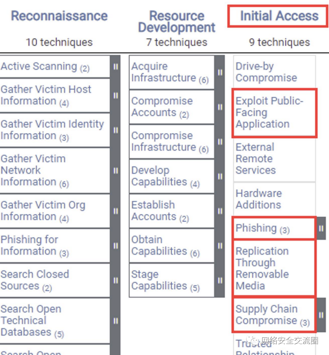 初始访问包括使用各种进入向量在网络中获得其初始立足点的技术。用于获得立足点的技术包括有针对性的鱼叉式网络钓鱼和利用面向公众的Web服务器上的弱点。通过初始访问获得的立足点可能允许继续访问,如有效帐户和使用外部远程服务,或者可能由于更改密码而限制使用。