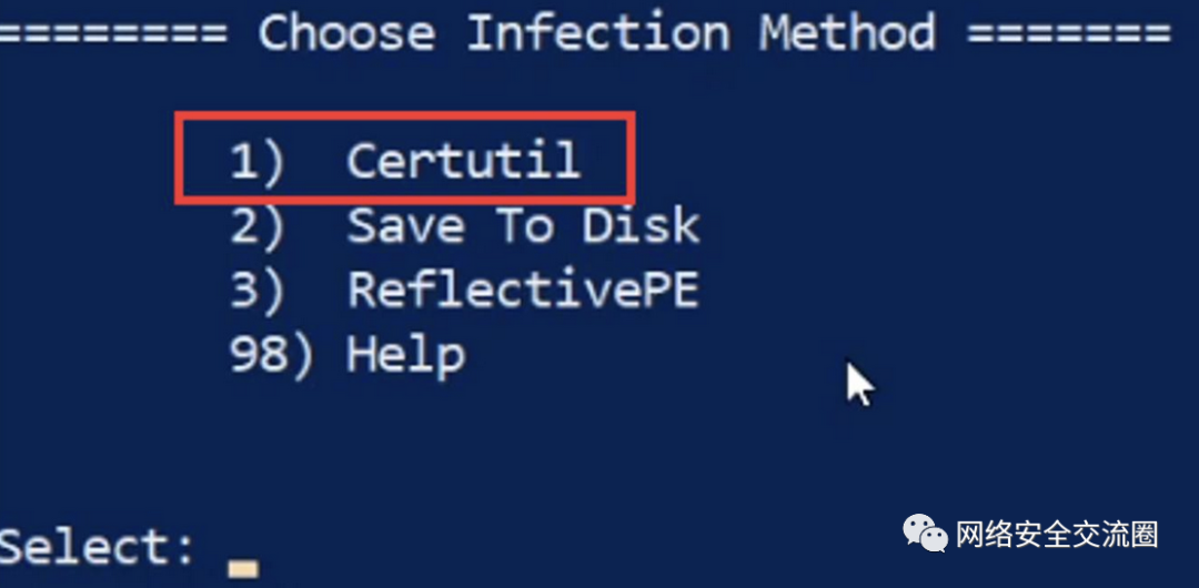 9、现在将提示您指定感染方法,在这种情况下,我们将使用“Certutil”方法,如以下屏幕截图中突出显示的。