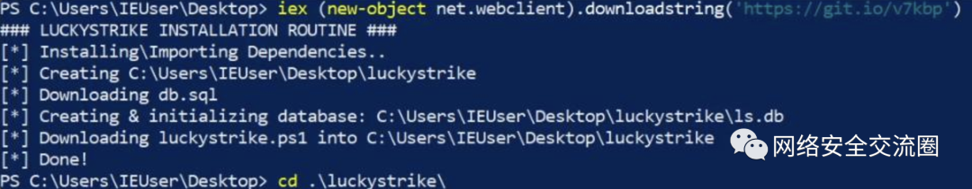 Set-ExecutionPolicy Unrestrictediex (new-object net.webclient).downloadstring('https://raw.githubusercontent.com/curi0usJack/luckystrike/master/install.ps1')这将下载所有的Luckystrike PowerShell脚本和文件到您的桌面上。