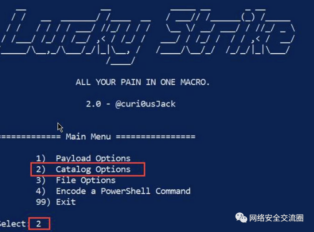 7、有效载荷现在应该被添加到Luckystrike目录中,您现在需要选择有效载荷。这可以通过导航回到Luckystrike主菜单并选择选项1来完成,如以下屏幕截图中突出显示的。