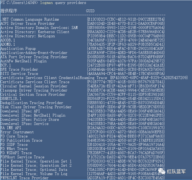 使用logman query providers命令查看所有的提供者。如图,执行结果的第一项是提供者名称,第二项是提供者对应的GUID。