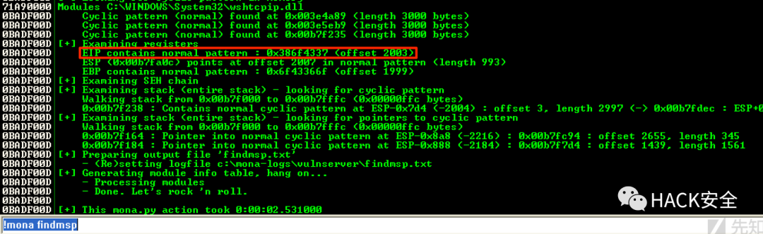 使用 !mona findmsp,确定该偏移量为2003字节。