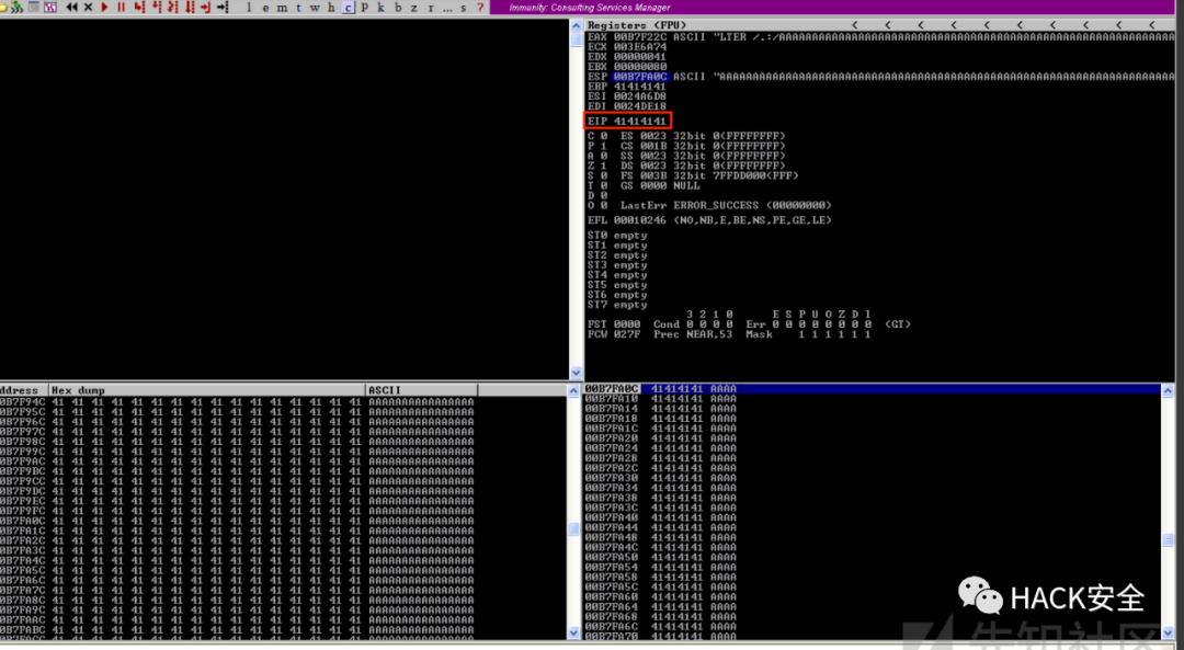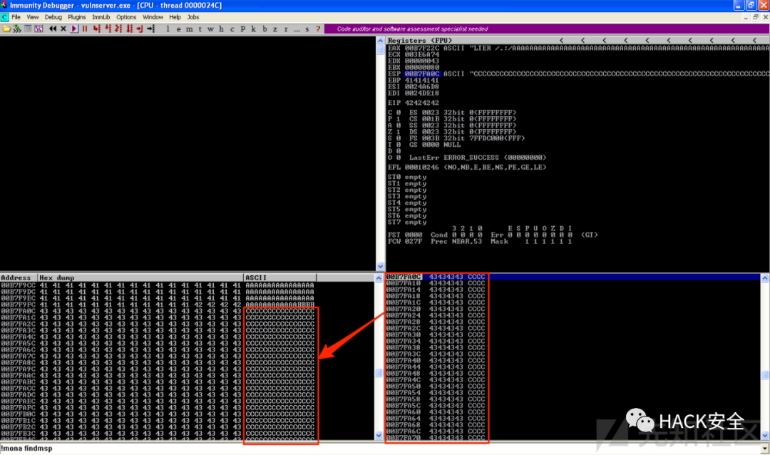 我们可以确定偏移量是正确的,4个B字符覆盖了EIP。还可以看到,ESP直接位于EIP之后,并指向C的缓冲区。