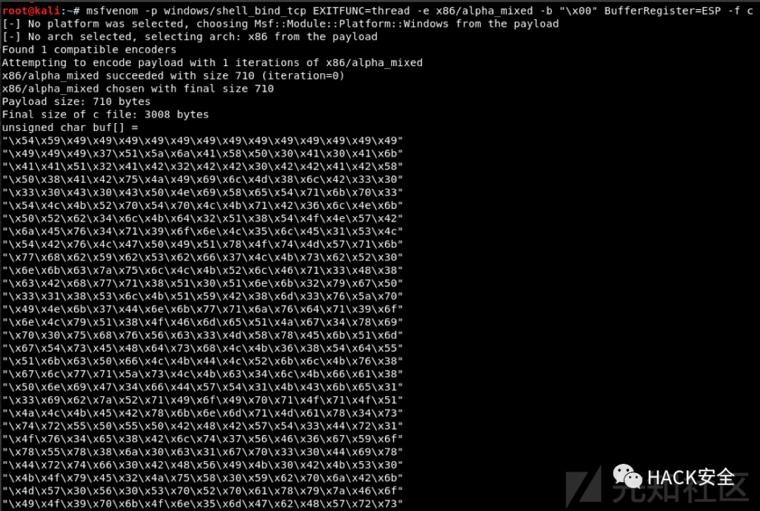 接下来,我使用alpha_mixed 编码器生成了一个shellcode。我必须要使用这个编码器来生成一个只包含允许的字符列表的shellcode。还应注意的是,我使用了BufferRegister=ESP这个选项。如果没有这个选项,shellcode将会从操作码\x89\xe2\xdb\xdb\xd9\x72开始执行。为了找到shellcode在内存中的绝对位置,我们需要这个操作码。目前,在这个漏洞中,我已经知道我的shellcode的绝对位置了。有了这个,我在生成shellcode时选择使用BufferRegister=ESP选项。