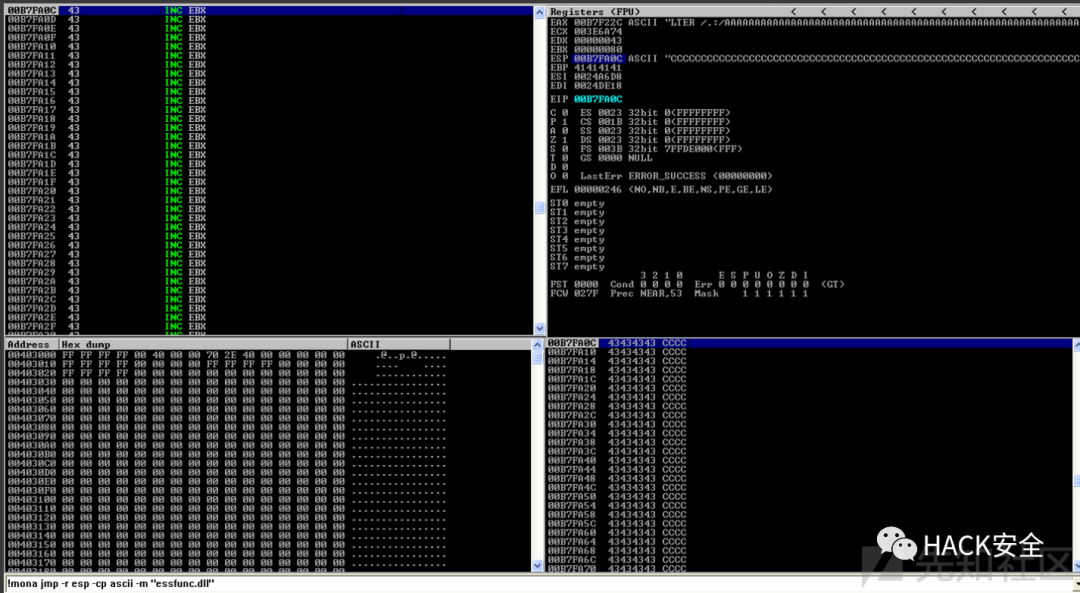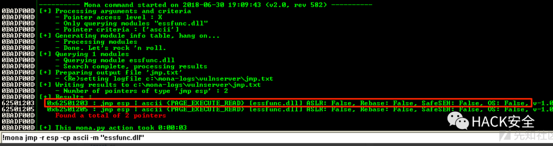 有了这个,我就用!!mona jmp -r esp -cp ascii -m "essfunc.dll " 命令来找到一个包含JMP ESP指令的地址。请注意选项-cp ascii。这是为了确保结果中的地址只包含ASCII字符。为此,我这里使用了第一个地址,即0x62501203。