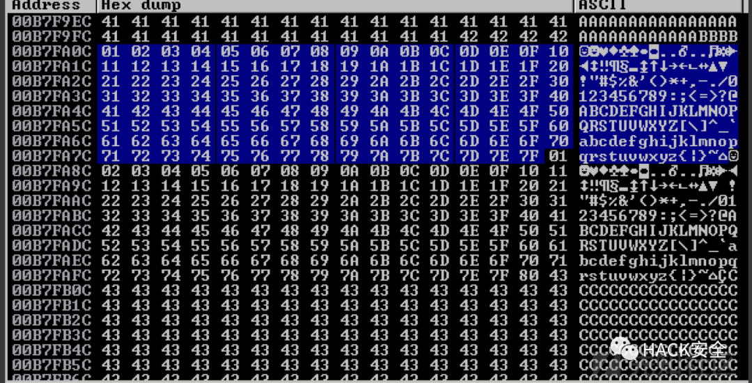 为了找到坏字符,我修改了以下代码,并将其存储在4个B的后面。