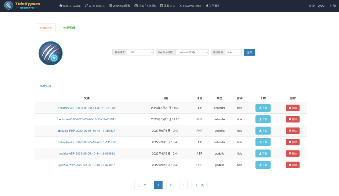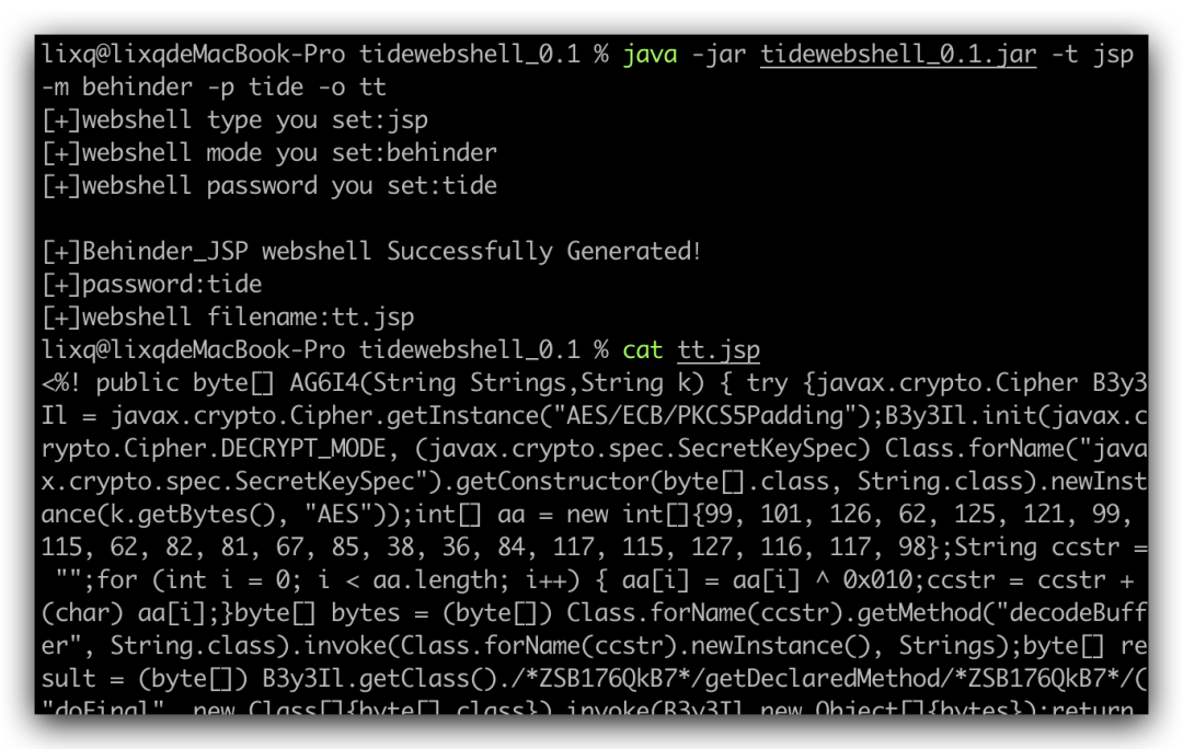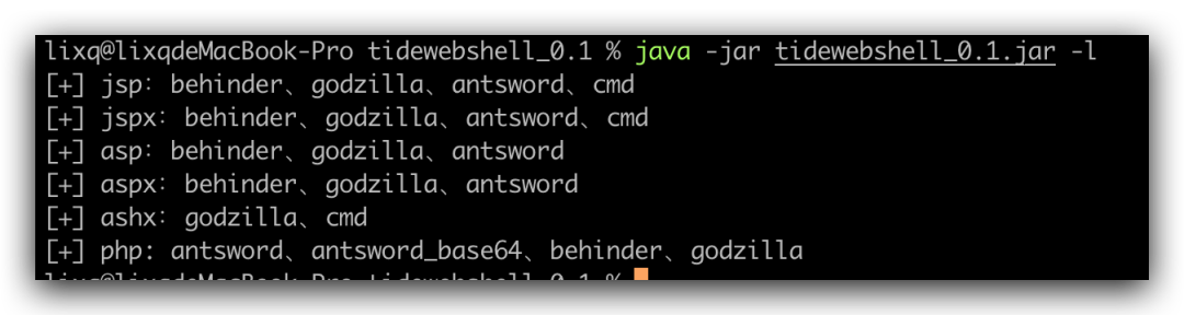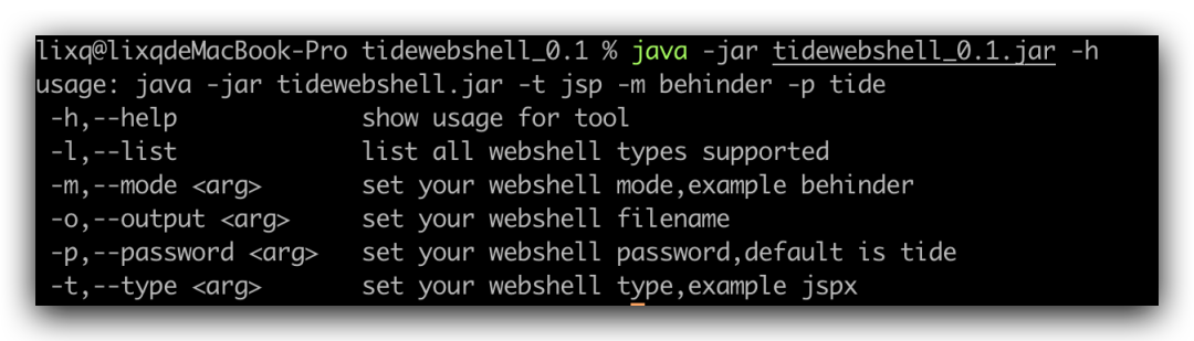 usage: java -jar tidewebshell.jar -t jsp -m behinder -p tide-h,--help show usage for tool //显示帮助信息-l,--list list all webshell types supported //列举所有支持的webshell类型-m,--mode <arg> set your webshell mode,example behinder //指定生成webshell模式,例如冰蝎-o,--output <arg> set your webshell filename //指定输出文件名,后缀会根据指定类型自动添加不必在此指定-p,--password <arg> set your webshell password,default is tide //指定webshell密码-t,--type <arg> set your webshell type,example jspx //指定webshell语言类型,例如jspx