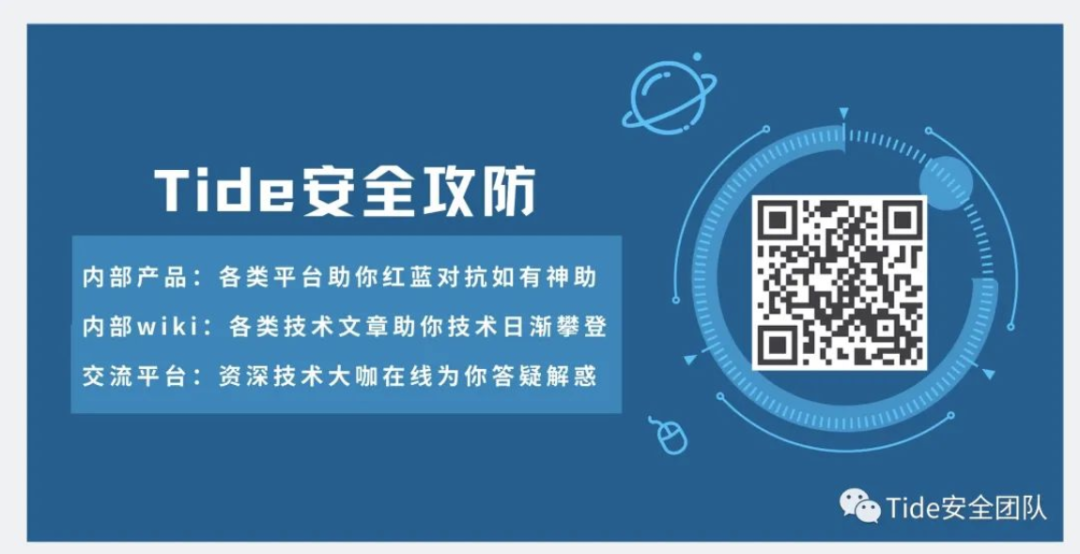 团队内部平台:潮汐在线指纹识别平台 | 潮听漏洞情报平台 | 潮巡资产管理与威胁监测平台 | 潮汐网络空间资产测绘 | 潮声漏洞检测平台 | 在线免杀平台 | CTF练习平台 | 物联网固件检测平台 | SRC资产监控平台 | ......