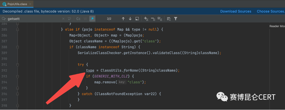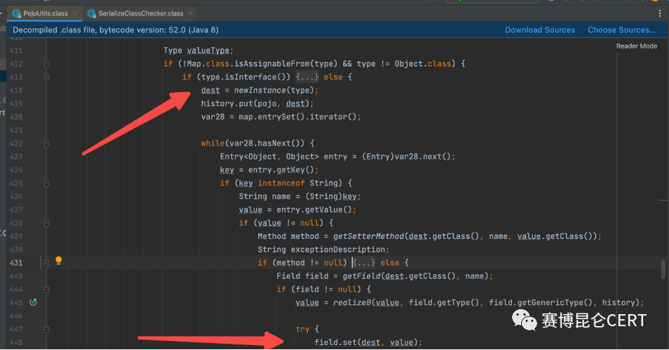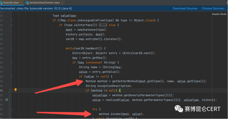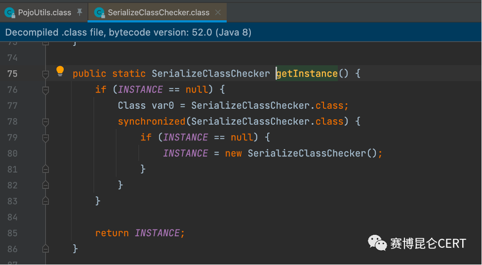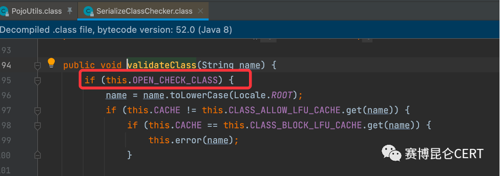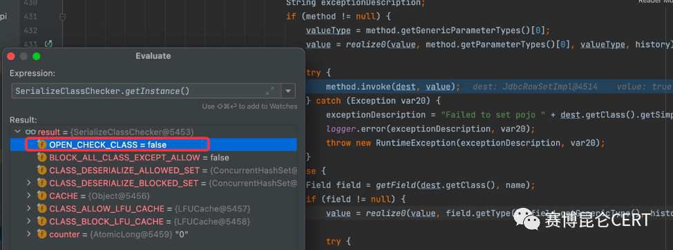 可以传入一个自定义的SerializeClassChecker覆盖SerializeClassChecker类中的INSTANCE ,就可以关闭黑名单检验,然后反序列化任意类。