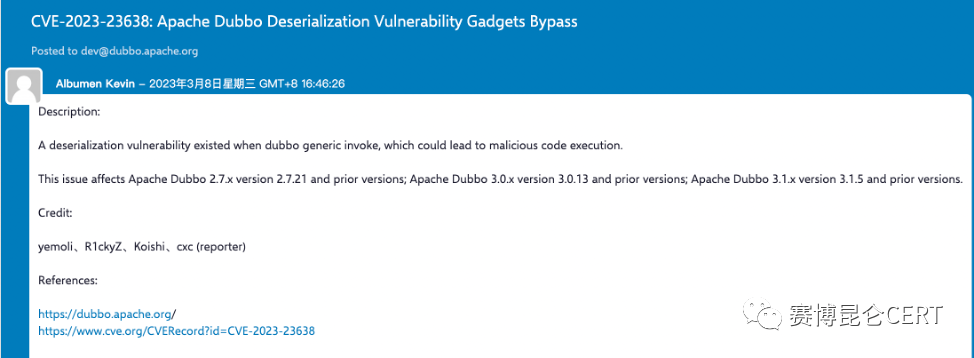 3月8日,Apache Dubbo 官方发布漏洞公告,Dubbo泛型调用存在反序列化漏洞,漏洞编号为 CVE-2023-23638。