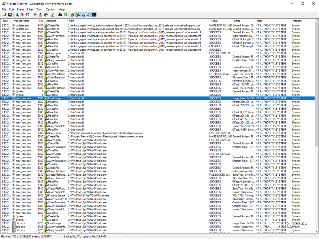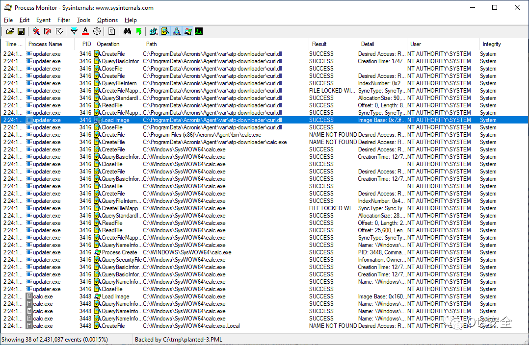 通过将编译后的curl.dll文件放入C:\ProgramData\Acronis\Agent\var\atp-downloader\目录并使用新的 Process Monitor 启动日志重新启动,我们可以看到运行 calc.exe 的有效载荷以 SYSTEM 权限运行。