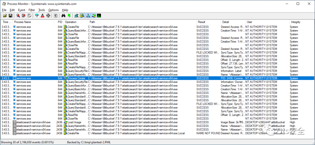 一旦我们使用进程监视器启动日志重新启动,我们可以看到我们植入的elasticsearch-service-x64.exe文件正在运行,而不是真正的文件,基于 Windows 计算器图标。