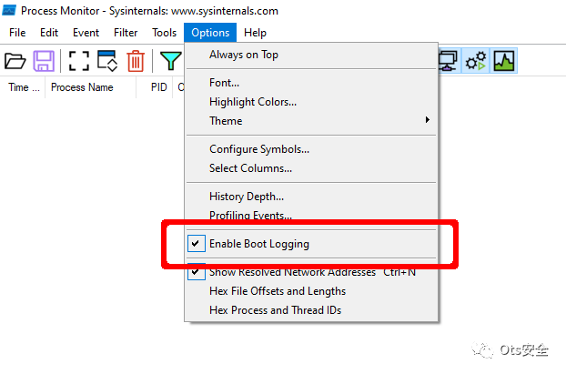 1.在 Process Monitor中,选择Enable Boot Logging 选项。