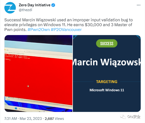成功!Marcin Wiązowski 使用不正确的输入验证错误来提升 Windows 11 上的权限。他获得了 30,000 美元和 3 个 Master of Pwn 积分。#Pwn2Own #P2O温哥华
