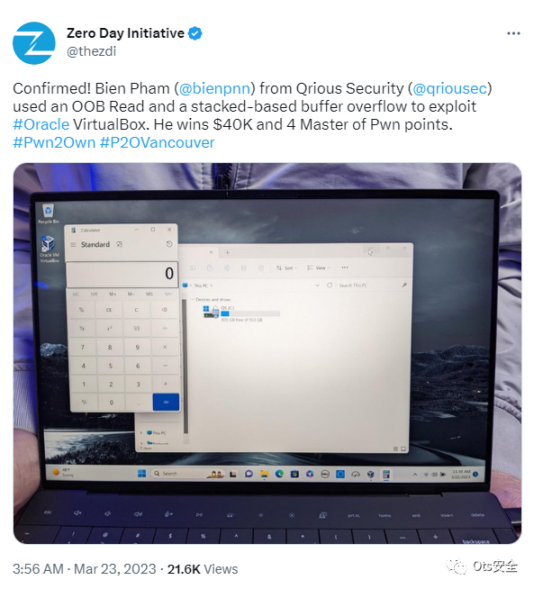 确认的!边范 (@bienpnn) 来自 Qrious Security (@qriousec) 使用 OOB 读取和基于堆栈的缓冲区溢出来利用#Oracle VirtualBox。他赢得了 4 万美元和 4 个 Master of Pwn 积分。#Pwn2Own #P2O温哥华
