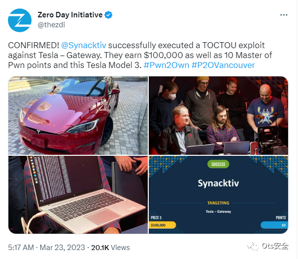 确认的!@Synacktiv成功地对 Tesla – Gateway 执行了 TOCTOU 攻击。他们赚取了 100,000 美元以及 10 个 Master of Pwn 积分和这辆 Tesla Model 3。#Pwn2Own #P2OVancouver