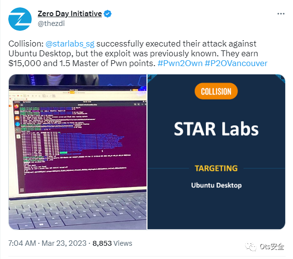 碰撞:@starlabs_sg成功地对 Ubuntu Desktop 进行了攻击,但该漏洞以前是已知的。他们赚取 15,000 美元和 1.5 个 Master of Pwn 积分。#Pwn2Own #P2O温哥华