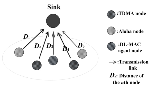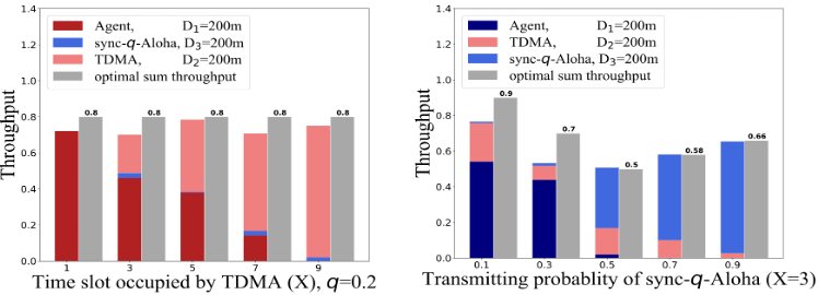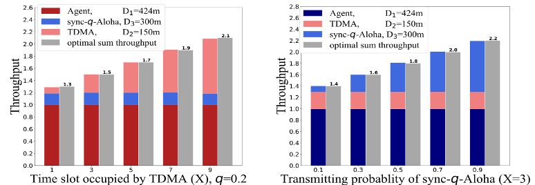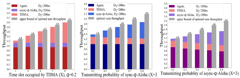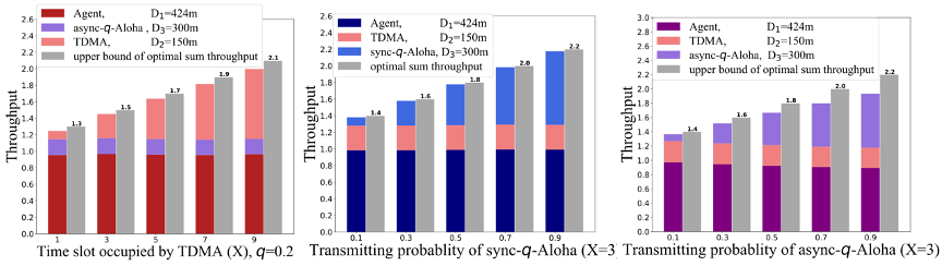 当sync-q-Aloha节点的传输概率固定在q=0.2时,即使TDMA节点将其占用率在Y为10时,将X从3增加9,其吞吐量也保持接近0.2。sync-DL-MAC agent还实现接近1的吞吐量,因为到sink的不同距离允许agent捕获由TDMA节点占用的相同时隙。因此,这种情况的总吞吐量随着TDMA节点的占用增加而增加。类似地,当TDMA占用率保持在X/Y=3/10时并且sync-q-Aloha节点的传输概率增加时,TDMA节点保持0.3吞吐量,而sync-q-Aloha节点随着Q增加而增加其吞吐量。该agent可以捕获几乎所有的时隙,吞吐量接近1。当三个节点位于不同距离的汇聚节点时,它们和谐共存。