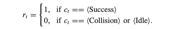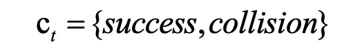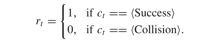 sync-DL-MAC要求网络中的每个节点从每个时隙开始以固定的时延进行传输,如图2(a)所示的同步模型所示。需要在一个时隙内完成数据包的发送和接收,所以需要时隙长度覆盖网络的最大传播延迟。agent的最优策略是捕获其他非agent节点未使用的空闲时隙,或者捕获已经被其他非agent节点使用但由于传输和传播延迟的差异而仍然可以被agent重用的时隙。在sync-DL-MAC协议中,agent作为纯源节点在每个时点可以采取以下两种操作之一:at = Transmit或No Transmit。根据源节点采取的操作,接收器检查碰撞并确定观察结果,ct = Success, Collision或Idle。Idle表示第t个时隙没有节点传输;因此,这个时间段实际上被浪费了。结合动作和观测信号,状态定义为