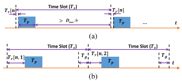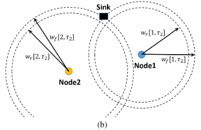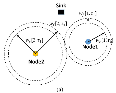 计算一个时隙内每个时间实例τ≤δ(T_s-T_g-T_r)的所有发射节点的波前。如果两个传输节点的环在汇聚位置的空间重叠,则表明碰撞。图3(a)所示的情况表明在τ1时间点没有碰撞,而图3(b)所示的情况表明在τ2时间点发生碰撞。