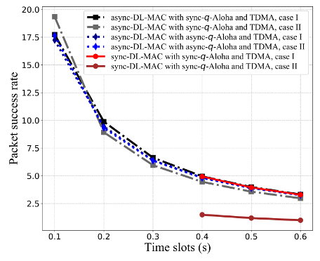 相比之下,async-DL-MAC中的agent有更多的动作可以选择:不传输或选择延迟传输,允许节点在不同的时隙中传输具有不同延迟的数据包。汇聚节点将检测不同时隙之间的冲突,而不需要在同一时隙内传输和到达。这使agent能够学习最佳时延作为每个时隙中的传输开始时间,以便更好地利用空闲时间。这种async-DL-MAC方案还使网络能够减少时隙长度,从而提高分组成功率。