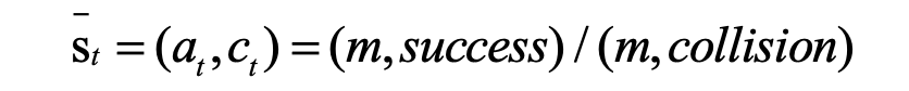 sync-DL-MAC有五种状态: st = (Transmit, Success)、(Transmit, Collision)、(No Transmit, Success)、(No Transmit, Collision)和(No Transmit, Idle)。为了适应不断变化的水下环境,agent必须考虑过去TW的时间段,吸取过去的经验。带有历史窗口的状态被定义为一个向量: