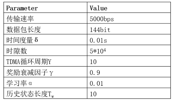 假设源节点使用不同的MAC协议共享时隙,其中一个节点配备了基于DL-MAC的agent,其他节点采用TDMA或slotted Aloha协议。agent尽量利用传输时间资源来提高吞吐量。因为TDMA和slotted Aloha都是分时协议,它们留下了一些空闲时间资源,可以由agent学习使用。本文假设在混合TDMA和slotted Aloha的环境下,对agent的学习能力进行评估。其中,TDMA节点在每y个时隙中使用x个分配的时隙重复发送数据包。Aloha节点可以使用两种协议中的一种进行传输:一种是sync-q-Aloha,另一种是async-q-Aloha。sync-q-Aloha在每个时隙开始时以q概率发送数据包。async-q-Aloha以q概率发送一个包,但可能在每个时隙内随机启动传输。DL-MAC节点采用提出的两种MAC协议之一:sync-DL-MAC或async-DL-MAC,其中sync-DL-MAC只能在一个时隙开始时以固定的时延发送数据包,而async-DL-MAC可以在不同的时隙以不同的时延发送数据包。