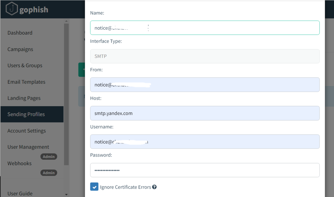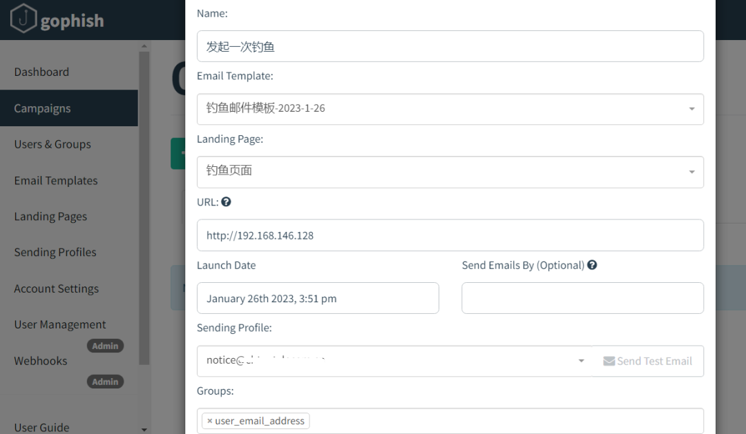 - Email Template: 钓鱼邮件模板,选择刚刚上面编辑好的钓鱼邮件模板;