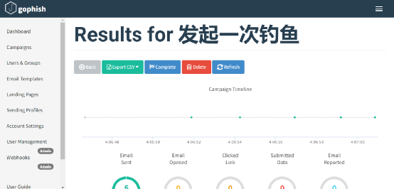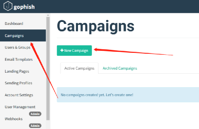 Campaigns 的作用是将上述四个功能Sending Profiles 、Email Templates 、Landing Pages 、Users & Groups联系起来,并创建钓鱼事件。(1)点击Campaigns -> New Campaigns(2)在窗口中写入需要的信息