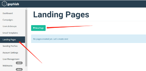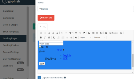 Landing Pages是设计一个钓鱼页面,可以获取用户的访问信息、登陆时账号密码等;(1) 点击Landing Pages -> new Pages- Import Site: 钓鱼页面的设计提供了两种方式,第一种Import Sit填写被伪造网站的URL,点击Import,即对目标网站进行克隆。内容编辑框是编辑钓鱼页面的第二种方法,即对导入的页面进行源码修改以及预览;