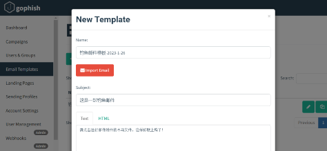 Import Email: 用户可以先在自己的邮箱系统中设计好钓鱼邮件,打开并选择导出为eml文件或者显示邮件原文,然后将内容复制到gophish的Import Email中,即可将设计好的钓鱼邮件导入,在点击Import之前需要勾选Change Links to Point to Landing Page,该功能实现了当创建钓鱼事件后,会将邮件中的超链接自动转变为钓鱼网站的URL;