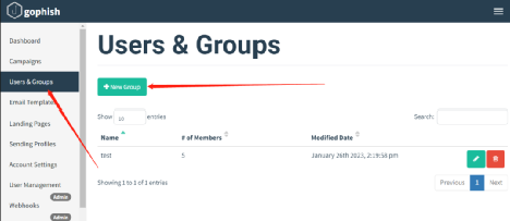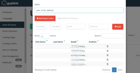 Users & Groups 的作用是将钓鱼的目标邮箱导入gophish中。(1)点击Users & Group -> New Groups- Bulk Import Users: 批量导入用户邮箱,它通过上传符合特定模板的
